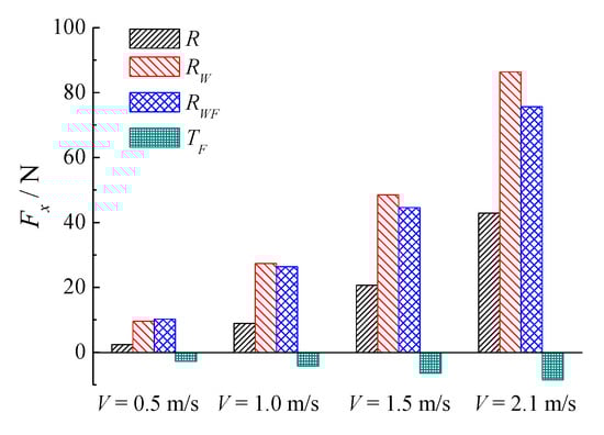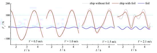 In this part, the ship speed V = 1.5 m/s (Fr = 2.0) is selected for analysis; the selected foil spans are h = 0.4 m, 0.6 m, 0.8 m, and 1 m, respectively. Among them, h = 0.8 m is slightly larger than the ship width, while h = 1 m is obviously larger than the ship width. The corresponding aspect ratio of foil is h/c = 2, 3, 4, and 5, respectively.
