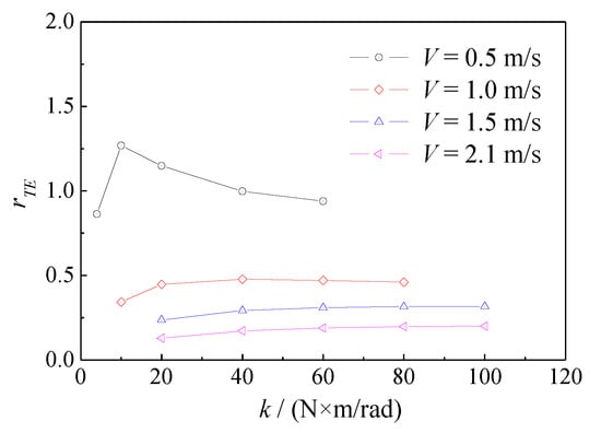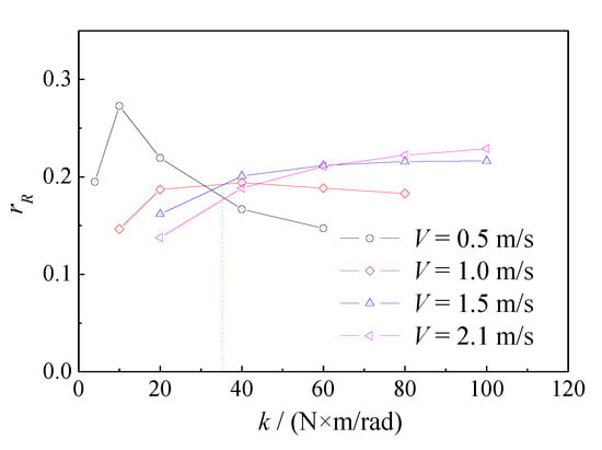 The previous research results on semi-passive flapping foil propulsion show that the spring stiffness k and frequency ratio r are two important parameters that affect the system performance. The relationship between them can be expressed as follow Equation (5) []. In this paper, a fixed and sufficiently small rotational inertia of the flapping foil = 001 kg·m2 is selected for the research because, when the frequency ratio is small, that is, the foil has a small rotational inertia, the semi-passive flapping foil can work well, and the influence of rotational inertia on hydrodynamic force can be ignored. The effect of spring stiffness on propulsion performance and motion of wave-augmented propulsion system is mainly discussed at a relatively lower rotational inertia of the flapping foil. The basic torsion spring stiffness is selected as