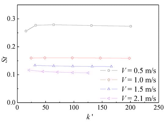and thrust coefficients for different numbers are shown in Figure 8. The results in this paper are in good agreement with Read and Schoveiler’s work. In addition, the calculation results under the same condition have also been compared with data from those experiments results, as described by Schoveiler. Figure 9 is vorticity pattern visualized in the foil wake for St = 0.45, f = 1.2 Hz, amax = 20°. The definitions of relevant parameters could refer to the expressions in the literature. The experimental and calculated results are compared and shown in Figure 9a,b separately, which agree with each other. In conclusion, the numerical method used in this paper is feasible and reliable for the hydrodynamic performance analysis of the flapping hydrofoil.