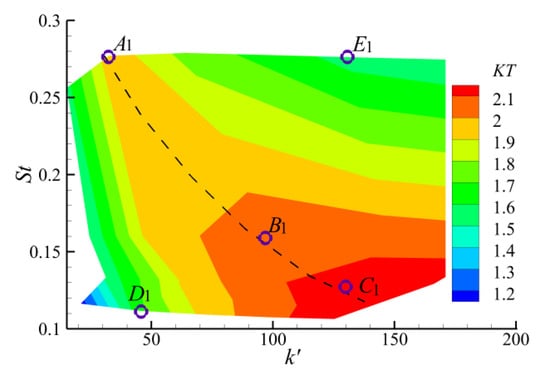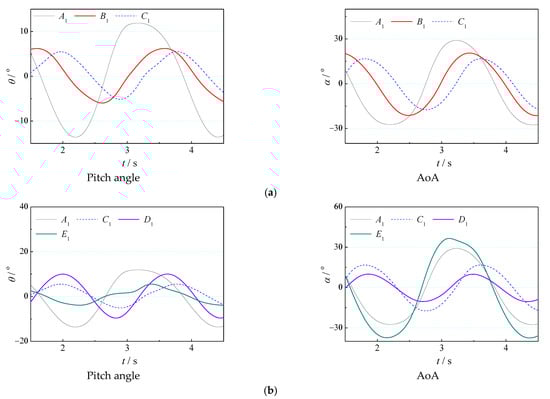The pitch angle and AoA of three working points A1, B1, and C1, which have high thrust coefficients, are compared in Figure 19a. As a whole, the time–history of the pitch angle and AoA of these three points are close to the sine curve, and the pitch motion period of the three working conditions increases with a decrease in St (increase in speed). Because the spring stiffness coefficients are well matched with St in these three working points, the pitch angles are all controlled at about 5–12°, and the maximum AoA is concentrated between 15° and 30°. With an increase in the spring stiffness from point A1 to point C1, the pitch angle gradually decreases, and the maximum AoA gradually approaches the optimal AoA of the semi-active flapping foil (15°) []. Therefore, the thrust coefficient from point A to point C also increases gradually.