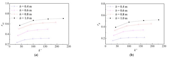 The change in thrust enhancement ratio and resistance reduction ratio of bow foil with different spring stiffness and different spans. (a) Thrust enhancement ratio rTE. (b) Resistance reduction ratio rR.