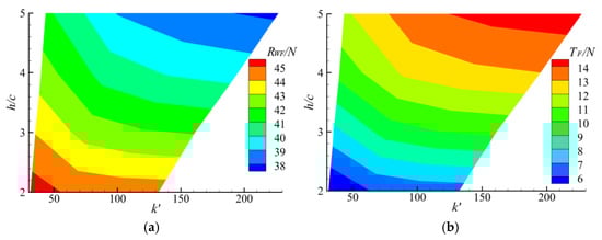Distribution diagram of hull resistance RWF and flapping foil thrust TF under different span and spring stiffness. (a) Hull resistance RWF. (b) Flapping foil thrust TF.
