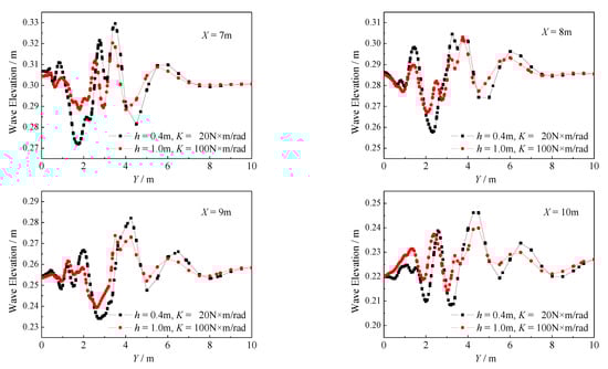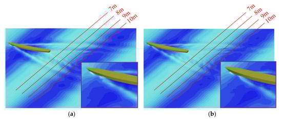 Finally, the influence of different thrust-increasing effects of the bow foil system on wave surface was observed. Two points with the lowest and highest thrust-increasing effects under V = 1.5 m/s working condition were selected, namely with the minimum spring stiffness and h = 0.4 m condition and the maximum spring stiffness and h = 1.0 m condition. The wave surface cloud diagrams of these two working conditions are shown in Figure 24. On the whole, the ship wave in Figure 24b is slightly weaker than that in Figure 24a. The head wave crest on the left side is higher and its wake is more obvious. In contrast, the stern wave on the right side is more discrete, the wave crest is not obvious enough, and the head wave is also more discrete. This corresponds to the hull resistance analyzed above. The right-side condition has less energy dissipation and hull resistance due to weak ship waves. In order to observe the ship wave more clearly, the distribution of wave height along the Y coordinate axis was observed at different distances from the stern. The X coordinate axis of the observation position was 7 m, 8 m, 9 m, and 10 m, respectively, as shown in Figure 24. Since ship waves are almost symmetrical, only the wave height curve on one side is shown in Figure 25. It can be clearly seen from the figure that, under the working conditions of , the wave height of the ship wave is generally smaller than that under the other working condition, which also shows that the bow foil can inhibit ship motion.