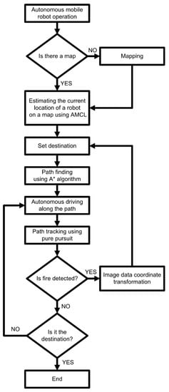 Figure 1 is a flowchart for the operation of an autonomous mobile robot while it is driving autonomously to surveil an engine room. The autonomous mobile robot must have a map for autonomous driving. If there is no completed map available, a suitable map must be created. The autonomous mobile robot uses AMCL on the map to estimate the current location. When a destination is set to the autonomous mobile robot, it found a path from the current location to the destination using the A* algorithm. The autonomous mobile robot tracks the path using the Pure Pursuit technique algorithm and drives autonomously. The autonomous mobile robot moves autonomously to its destination and surveils the engine room through a camera continuously. If a fire is detected during surveillance, the location of the fire is set as a new destination on the map by converting the coordinates of the detection box image data. Then, it starts sequentially from the set destination block and stops the operation of the autonomous mobile robot when it arrives at a new destination (i.e., a fire point).
