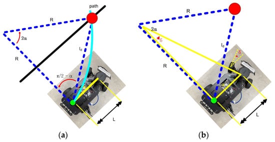 Pure Pursuit path tracking control. (a) Geometry of Pure Pursuit for look ahead distance. (b) Geometry of Pure Pursuit for δ. The red circle is the point the robot want to track, and the blue dashed line connecting the red circle and the center of the rear wheel of the robot is the look ahead distance (ld). The robot steers and turns to move to the tracking point, and the arc of the circle created at this time is the arc marked in light blue. The radius of the circle made using the light blue arc is R. L is the length connecting the center of the front and rear wheels of the robot.