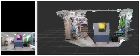 The coordinates of the center of the bounding box are camera coordinates based on pixels. In order to move the autonomous mobile robot to the position of the bounding box, conversion to the distance unit coordinate is required. In this study, Algorithm 3 was used to calculate RGBD image data corresponding to the coordinates of the RGB image data. In the algorithm, xmax, ymax, xmin, and ymin represent the maximum and minimum coordinates of the x and y axis of the RGB image data, and the point is the RGBD image data corresponding to the RGB coordinates. The point has x, y, and z-axis distance data from the camera. In Figure 3, the left side is the detection of fire in the RGB image, and the right side is the coordinate conversion of the RGB image to RGBD through Algorithm 3.