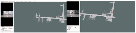 In the experiment, we used LiDAR to create a map of the place to be tested and estimated the current location from the created map. After setting a destination and finding a path, it autonomously drives to the destination. Figure 5 shows the two kinds of paths used in the experiment. In the figure, the blue dot is the robot’s current estimated position, while the red dot is the robot’s destination. On the map, black is the point where the robot cannot move, gray is the movable area, and light gray is the path that the autonomous mobile robot has found.