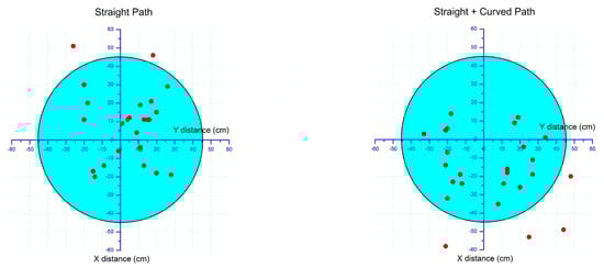 Figure 6 shows the arrival point of the autonomous mobile robot based on the destination. The x-axis is the forward and backward distance, the y-axis is the left and right distance, and (0, 0) represents the destination. In the figure, the sky color circle has a radius of 45 cm, representing the range of successful arrival. In the straight path, it was confirmed that the destination was approached almost similarly, and in the combination of the straight and curved path, it was confirmed that the majority of the arrival points were before the destination. These results are presumed to indicate that the autonomous mobile robot did not arrive at the destination owing to the slippery floor material during rotation. However, it was confirmed that the arrival range was within 1% of the path distance in most cases.