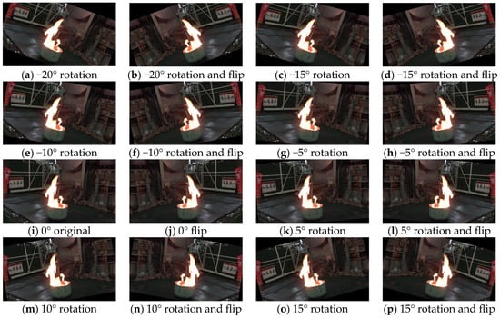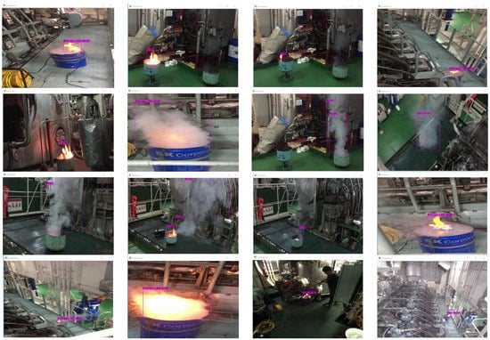 In the experiment on the fire detection performance, the fire of the test dataset was detected with the weight file obtained by learning the fire dataset using Tiny-YOLOv3. The dataset used the fire dataset of Kim [32], and this dataset was obtained through a simulation experiment assuming a fire on a ship. A total of 1938 fire datasets were divided into 502 training data and 1436 test data. The learning data was augmented to 8032 by image rotation (−20~15°) and horizontal flip to increase the learning effect. Figure 7 shows augmentation in the training data.