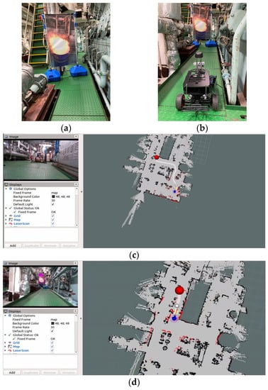 Figure 9 is the engine room surveillance experiment image. Figure 9a,b are images of the virtual fire installation banners. Figure 9c,d are the graphical user interface (GUI) images. In these images, the left shows the camera image that the autonomous mobile robot is looking at, and the right shows a map. On the map, the blue dot represents the current location of the autonomous mobile robot, and the red dot represents the destination. The light gray from the current location to the destination is the found path. The initial destination was set to a location near fire and autonomous driving was performed. Figure 9d shows that the autonomous mobile robot detects a fire and changes the destination while moving toward the initial destination autonomously. The detected fire is displayed as a red square box on the left camera image of the GUI, coordinates are converted, and sent to the autonomous mobile robot as a new destination. Comparing Figure 9c and Figure 9d, the destination has changed. Figure 9b is the engine room image of Figure 9d. Comparing Figure 9b and Figure 9d, it can be confirmed that the fire is located next to the stairs, and the new destination is also located next to the stairs.