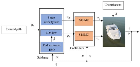At present, regardless of the types of trajectory tracking strategy, many research results have been achieved on the USV trajectory tracking by various control methods, including model predictive control [,], backstepping [], dynamic surface control [], sliding mode control [], prescribed performance control [], neural networks [], and so on. Because of the complex nature of the environment, controllers of USVs have to be robust against different unknown external disturbances such as winds, waves, and currents. The sliding mode technique, regarded as a remarkable robust control method, has been widely used because of its fast response speed and strong robustness.