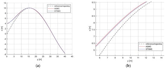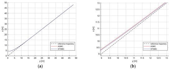Table 2 contains the metric comparison between controllers, including the mean squared error and Euclidean norm []. The mean squared error is the average of the squared difference between the desired and the actual value of a variable. Thus, the MSE is used to quantify the controller performance according to how small the steady-state error is. The Euclidean norm is the square root of the sum of the squares of the vector values. Hence, the Euclidean norm is used to quantify the amount of control effort used by each controller. The STSMC does not consume more control input energy and it improves the tracking accuracy.