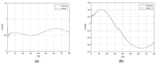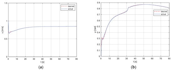 The desired and actual ((a) the surge speed and (b) the heading angle).