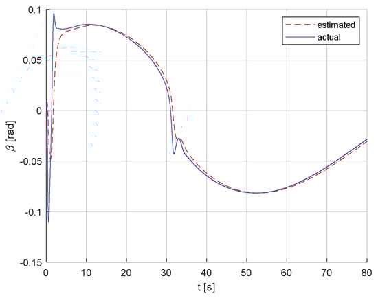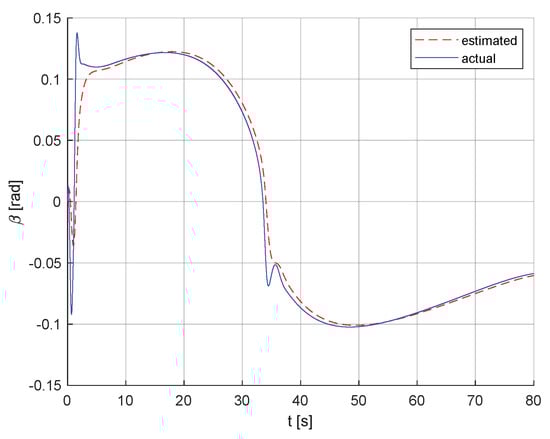 To design better guidance laws for precise tracking, the drift angle has to be considered. The drift, or sideslip angle, is the angle between the heading angle and the course angle. The sideslip angle can be attributed to the sway velocity component and is caused by the lateral acceleration while turning []. The effect of wind and wave currents on the USV increases the variation of the sideslip angle. Therefore, if the navigation direction of the USV is accurately guided, the desired trajectory can be accurately tracked. To compensate for the sideslip angle in the guidance law, the most straightforward way is to measure it by means of sensors and add it to the guidance law. However, in many cases, it is difficult to measure sideslip angle accurately with cheap optical correlation sensors []. Or, the sideslip angle is calculated with the velocities of the USV according to the formula. There are other ways to alleviate the effects of sideslip angles. The integral LOS (ILOS) guidance method was presented [], and the influence of a sideslip angle on the USV was eliminated by adaptive law []. Indirect adaptive control methods were proposed. For example, two predictors were developed for the estimation of the tracking error and were proposed to indirectly estimate the sideslip angle []. In [,,,], it is assumed that the sideslip angle is quite small (less than 5°), constant, or slowly varying. However, when the USV is disturbed by time-varying disturbances, the sideslip angle is greater than 10°. In this case, the approximate method is unreasonable. Therefore, the accurate direct estimation of the time-varying sideslip angle is very important for USV accuracy tracking.