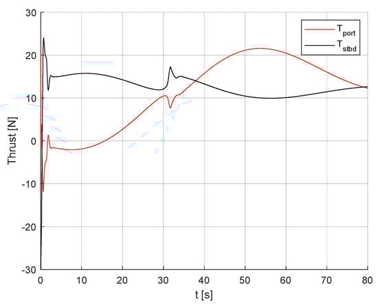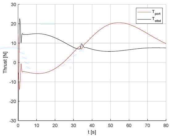 In addition, Equation (2) represents the vectors of forces and moments generated by the two thrusters and .