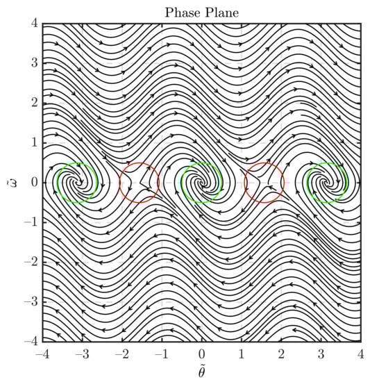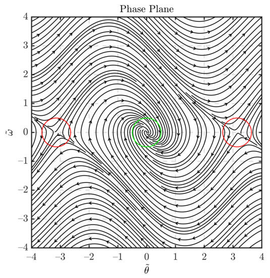 where is the electrical angular velocity estimation error and , are positive. The phase plane of the system is shown in Figure 5, where is the saddle point, and is the stable focus. The trajectory in the phase plane of the system would converge to the origin, i.e., the position and velocity estimation errors would converge to zero, and the system would be able to precisely estimate the rotor position.