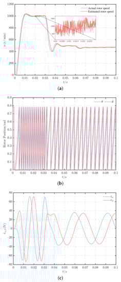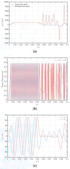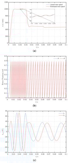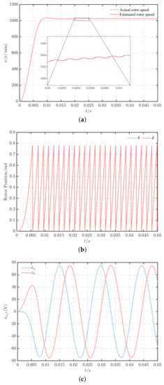 Responses of simulation with improved SMO combined with feedforward PLL (dynamic). (a) Rotor speed. (b) Rotor position. (c) Estimation of the back-EMF.