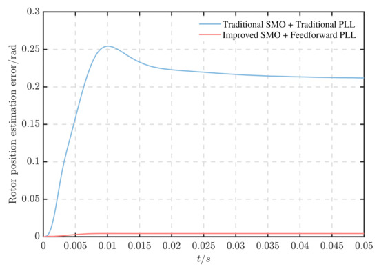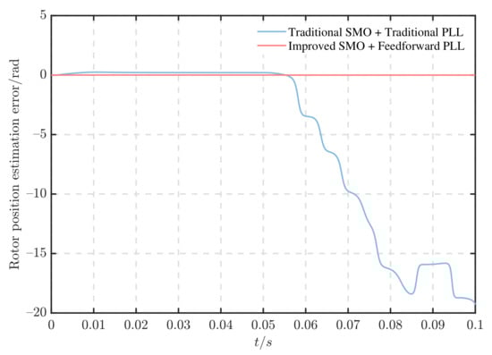 When the motor is unloaded and its speed is set to 1000 r/min, the steady-state performance of the motor under each algorithm is compared. From Figure 10a and Figure 11a, it can be observed that both the conventional algorithm and the improved algorithm can keep the motor running steadily, with the conventional algorithm having a speed fluctuation range of ±5 r/min and the improved algorithm having a speed fluctuation range of ±0.1 r/min. Therefore, the improved SMO may effectively mitigate the speed chattering issue. The peak rotor position estimation error is 0.255 rad and the steady-state error is 0.212 rad for the conventional algorithm, whereas the peak rotor position estimation error is 0.0043 rad and the steady-state error is 0.0042 rad for the improved algorithm (Figure 10b, Figure 11b and Figure 12). Consequently, the improved feedforward PLL provides superior position tracking performance.