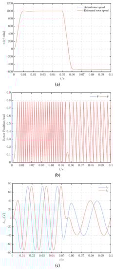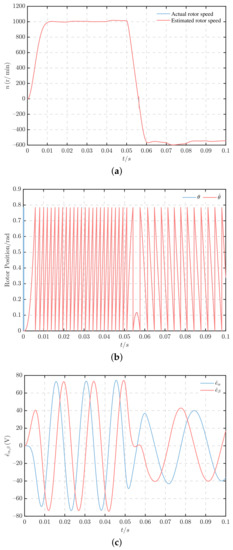 Responses of simulation with the improved SMO combined with feedforward PLL (forward and reverse). (a) Rotor speed. (b) Rotor position. (c) Estimation of the back-EMF.