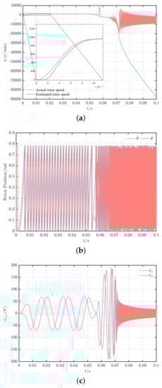 Responses of the simulation with improved SMO combined with feedforward PLL (with propeller load). (a) Rotor speed. (b) Rotor position. (c) Estimation of the back-EMF.