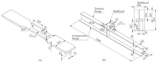 Two types of fatigue test specimens were fabricated: coupon-shape specimens for fatigue testing under the uniaxial tension load condition (Figure 1a), and large-scale welded beam specimens for fatigue testing under four-point bending. Henceforth, in this paper, these two specimen types are referred as tensile specimens and beam specimens as per the load configurations. The purpose for using beam specimens was to replicate the manufacturing conditions of such structural details and, on the other hand, achieve welding residual stress state comparable with actual large-scale structures. With the tensile specimens, the test frequency could be increased, and a higher number of specimens were tested. In total, 6 beam specimens and 21 tensile specimens were tested. In the tensile specimens, the bulkhead plate transverse to the beam (see Figure 1b) was not attached to the specimen during fatigue testing but was attached to the specimen during welding to replicate the accessibility at the cope hole detail.