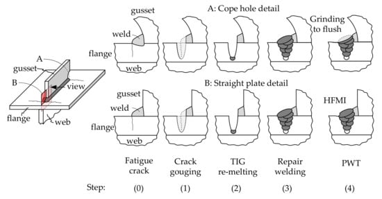 In the beam specimens, the repair welding was also studied to investigate the potential to rehabilitate pre-fatigued structures. The repair welding was applied to those four specimens tested in the AW condition. The fatigue tests of the beam specimens were stopped after crack reaching a depth of 10–15 mm. This depth corresponds to the crack size that can be clearly seen observed in real applications but is still repairable. The repair welding procedure was conducted as follows (Figure 2):