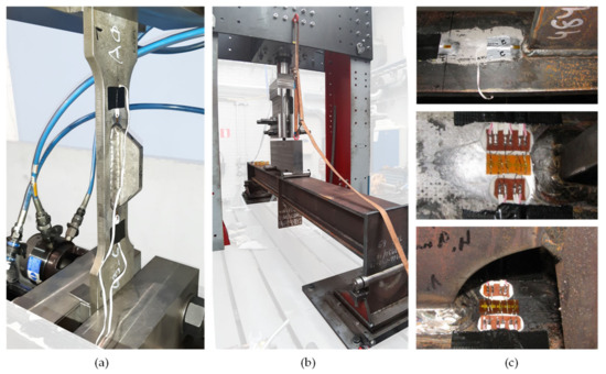 The test specimens were equipped with strain gages to capture both nominal strains (verifying test loads in the beam specimens) located far from the joint area and local structural strains at the hot-spot distances. In the tensile specimens (with the narrow web member), the HS strain gages were located at the 0.4t and 1.0t distances from the weld toe (type ‘a’ HS location). In the beam specimens, strain gage were located at 4 mm, 8 mm, and 12 mm distances from the weld toes as per the type ‘b’ HS location [19]. The HS strain measurement was conducted using strain gage chains. The strain gage instrumentation is exemplified in Figure 4c.