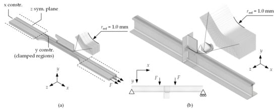 To account for the effects of the studied specimen geometries and load configurations on the resulting stress concentrations, as well as to employ local approaches in fatigue assessments, numerical FE analyses were carried out using 8-noded brick shape linear solid elements with FEMAP 2022.2 (Siemens PLM) software. The geometry models for the tensile and beam specimens were created to include fictitious notch radii at the critical weld toes as per the concept of the effective notch stress (ENS) [20] with the reference radius of rref = 1.0 mm. Half symmetry was utilized in the model for the tensile specimens. At the critical toe position, element side length (tangential direction) was 0.10 mm with an aspect ratio of 2.5:1 (tangential/radial). The boundary and load conditions were modeled according to the test load conditions, i.e., under uniaxial tension and four-point bending loads in the tensile and beam specimens, respectively. Figure 5 presents the element mesh models together with the load and boundary conditions.