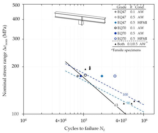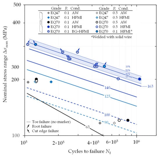 where k is the characteristic value and Stdv is the standard deviation. With this approach, characteristic fatigue strength capacity of Δσc,97.7% = 163 MPa was obtained for the EQ70 specimens in the HFMI-treated condition under the R = 0.1 load conditions (see Figure 6).