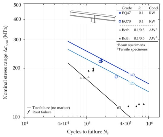 Figure 8 presents the fatigue test results for the beam specimens. For these specimens, the nominal stresses were obtained based on the acting bending moment and section modulus of the beam. The fatigue strength of the beam specimens was slightly lower than that of the tensile specimens. However, FAT63 was conservative in comparison to the test results.