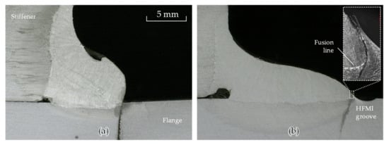 The initially fatigue-tested HFMI-treated specimens suffered from the sharp transition with low notch opening angle, and HFMI tool pin was inaccessible to treat the weld toe. The depth of the HFMI groove was acceptable and groove visually showed acceptable conditions; however, the pin did not reach the original toe position, as demonstrated by the crack paths. Based on the fatigue test observations on the HFMI-treated joints manufactured with the solid wire (Figure 6 and Figure 7), the unmanufacturable HFMI treatment was related to the applied rutile-cored wires. These wires are specifically intended for all welding positions with good productivity, which is meaningful in shipyard conditions. However, from the HFMI treatment viewpoint, weld toe grinding, or other technique would be needed to confirm successful HFMI treatments. This was also outlined in the IIW Recommendations for the HFMI treatment [24]. In burr-ground and, subsequently, HFMI-treated specimens, two fatigue failure modes were observed: fatigue cracks originated from both weld root and cut edges. The change between these two failure modes is expectedly related to the weld root quality in the gusset tips. In the case of lack of fusion in the frontal surface of stiffener, this initial defect, transverse to the loading direction, acts as a crack initiation/propagation location. If the successful fusion of the frontal surface is reached, a competing crack initiation from the cut edge is present.