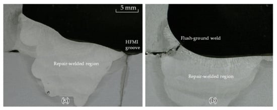 Macro graphs on the root failures in the successful HFMI treatments: (a) burr-ground and HFMI-treated specimen, and (b) HFMI-treated specimen (prepared using the solid wire).