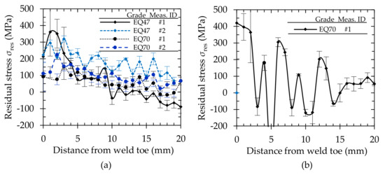 Figure 13 presents the XRD measurement results on the surface residual stresses along the specimen’s flange starting from the weld toe position. As expected, the welding residual stresses were highly in tension in both investigated specimen types in the AW condition–roughly 50% from the yield strength of the material. In the beam specimens, plate surface conditions potentially are a cause for the varying and highly scattering results, i.e., showing both tensile and compressive residual stress in the vicinity of the weld. However, the results provide an overview on the magnitude of the residual stresses in the specimens, confirming that the specimens represent real ship conditions with high tensile residual stresses. By applying the HFMI treatment, an introduction of compressive residual stresses was confirmed. Furthermore, a strain hardening phenomenon [25] could be identified by the measured full width at half maximum (FWHM) values, as seen in Table 5. The measurements were performed on the individual specimens of the series, and the bulkhead stiffener caused some geometrical inaccessibility to measure weld toe position (low tilting angles were applied in the XRD measurements). Due to these reasons, the results were slightly scattered, particularly in the case of the EQ47 specimens. In addition, compared to the yield strength of material, the EQ70 specimens had slightly lower residual stresses. Potentially, this can be explained by the microstructural (volume) changes at the heat-affected zone with the EQ70 steel with a higher carbon content.