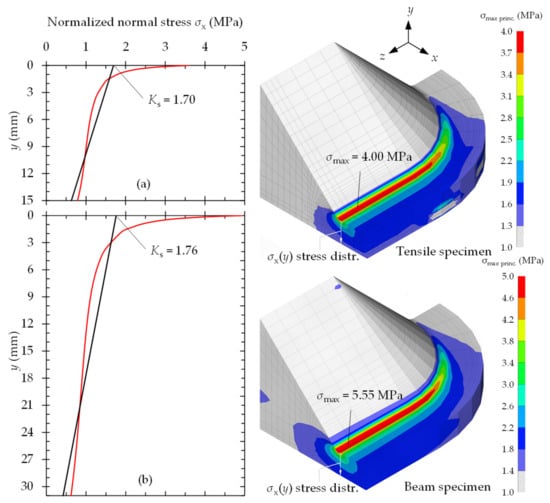 Results of FE analyses: stress distributions and obtained structural SCFs and ENSs at the toe positions using the maximum principal stress criterion: (a) the tensile and (b) beam specimens.