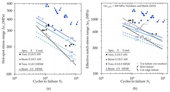 Fatigue test results in terms of (a) structural HS stress and (b) ENS systems [26].