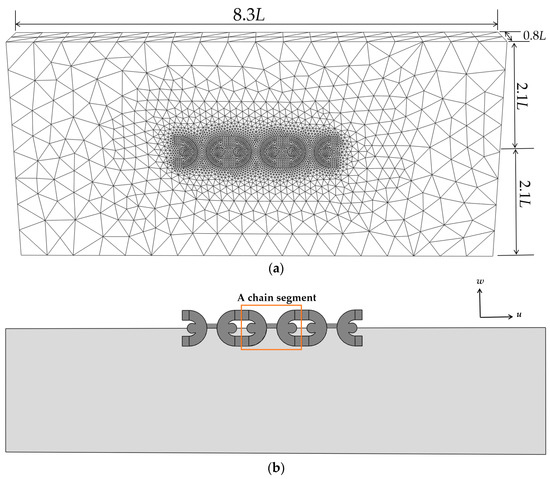 The chain segment was treated as a rigid body and a reference point was defined for each chain segment. The normal and tangential displacements, in terms of w and u, respectively, shown in Figure 2b, were applied on all reference points to specify the movements of chain segments (i.e., the load is applied in displacement-control mode). The soil domain in the finite-element model had a length of 8.3 L, width of 0.8 L and height of 4.2 L, as indicated in Figure 2a; the boundary effects were avoided as found in trial calculations.
