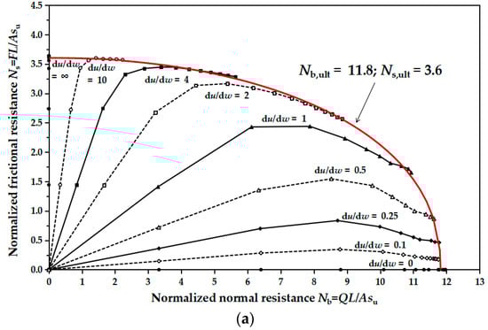 where the exponents m and n are to denote the shape of the envelope and they are determined by fitting the LDFE results in Figure 8. The Nb,ult values of 11.8, 12.2 and 12.8 are estimated from data in Figure 5 for the chain roughness, with α = 0.3, 0.5 and 1.0, respectively, while Ns,ult = 3.6, 3.9 and 4.3, as demonstrated in Figure 7b. The exponents are selected as m = 2.1 and n = 2.3 for all chain roughness values. It indicates that the shape of the yield envelope is nearly independent of the chain roughness, although Nb,ult and Ns,ult are functions of the roughness. As shown in Figure 8, Equation (7) with the values stated above can accurately depict the final phases of the loading paths. As the normal and tangential resistances are varied along the yield envelope, the friction ratio F/Q could not be a constant value, even though the assumption of constant ratio was recognized widely in the previous studies [9].
