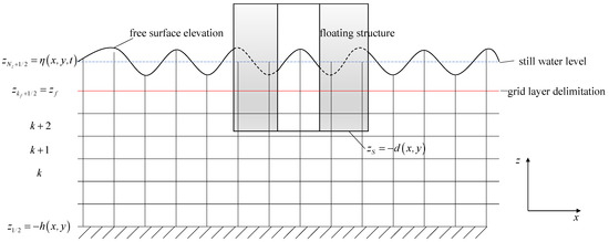 The development of non-hydrostatic models began in the late 1990s and was first proposed by Casulli and Stelling [9] and Stansby and Zhou [10]. The advantage of the non-hydrostatic model over the traditional viscous flow model is its computational efficiency. The free-surface elevation is only defined as a single-valued function of the horizontal position, and the kinematic free-surface boundary condition can effectively track the surface motion with relatively small computational costs. Nowadays, non-hydrostatic models can simulate wave motion deformation [11,12,13,14,15] and wave breaking [16,17,18], and some non-hydrostatic models can simulate wave interactions with structures [19,20,21,22,23] as well as the effect of vegetation on wave propagation [24,25], and even tsunami propagation [26]. However, the assumption that the wave surface is a single-valued function of the horizontal position in the non-hydrostatic model makes it complicated for the non-hydrostatic model to simulate the case in which the bottom permeable surface of the building is exposed to the water, and the introduction of the immersed boundary condition may solve this problem. The non-hydrostatic models adopt the direct-forcing immersed boundary (IB) method to simulate wave interactions with structures [20,27,28], which are treated as virtual bodies, and non-slip boundary conditions are used on the surface of the structure. This provides the non-hydrostatic model with the ability to calculate the resonance of the water in the inner domain of the floating platform.