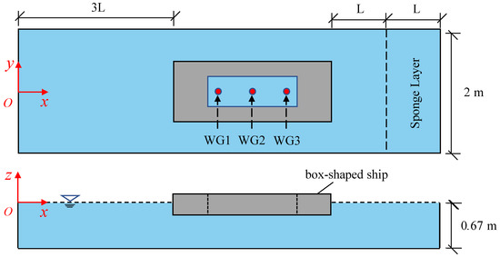In this test case, the resonant frequencies and resonant amplitudes of the water in the rectangular internal domain of the box-shaped ship under wave action are considered. The results of the model’s calculation in this paper are compared with the experimental data from Price, Magee and Feng [7]. As shown in Figure 4, the floating box-shaped ship has the dimensions of , , , and the rectangular internal domain has the dimensions of , , . The coordinate origin is located at the center of the wave-making boundary at the still-water surface. In all tests, the water depth is 0.67 m, and the draft of the ship is 0.16 m. The incident waves are regular waves that are generated with linear wave theory. The wave height , the wave frequency range , and the frequency interval . The length of the numerical flume is determined by the wavelength , and for each wave, a minimum of three wavelengths were generated before reaching the bow of the ship. Three evenly spaced wave gauges (WG) are located on the centerline of the moonpool, where WG 1 (closest to the bow) and WG 3 (stern) are located at 0.02 m from both sides of the inner wall of the ship and WG 2 is located in the middle of the moonpool. According to Price, Magee and Feng [7], WG3 always records the maximum wave elevation when water resonance occurs in the inner domain of the ship. Subsequently, WG 3 is employed as a representative of the free-surface elevation in the inner domain of the ship.