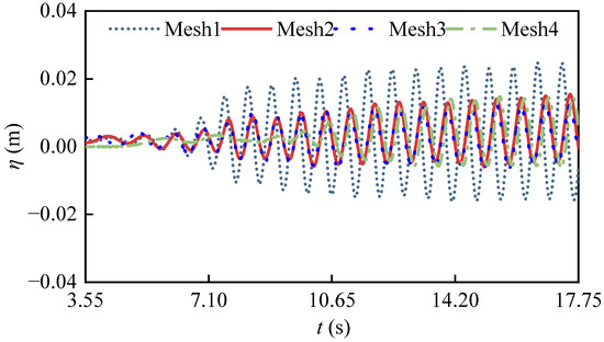 First, select the case with a wave frequency of , and four different grid configurations are then to be used for the grid convergence verification; detailed information is shown in Table 1. In the whole computational domain, a uniform horizontal grid is used. With the four grid configurations, the free-surface elevations of the ship’s inner domain are plotted in Figure 5. The simulation on Mesh1 predicts larger values of free-surface elevation than the simulations on the other grids, and the numerical results calculated on Mesh2, Mesh3 and Mesh4 are closer to each other. Considering the computational cost and efficiency, all cases are calculated using Mesh2.