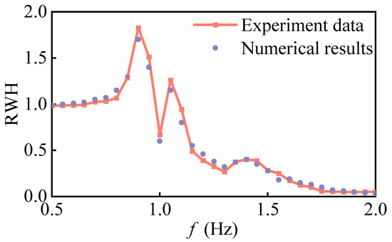 Figure 6 shows the comparison of the resonant frequencies and resonant amplitude values of the water in the inner domain of the box-shaped ship calculated by the non-hydrostatic model with the experimental results from Price, Magee and Feng [7]. RWH is the relative wave height of WG3, which is determined by the wave height ratio in the ship’s inner domain, recorded by the wave gauge to the incident wave height. From Figure 6, it can be seen that the frequency locations of the piston mode and the first-order sloshing mode, calculated by the non-hydrostatic model, are the same as the experimental results, which indicates that the model has good dispersion characteristics for both long-wave and short-wave. The root mean square error between the predicted free-surface elevation of the inner domain of the ship and the experimental results is 5.68%, which is in good agreement overall.