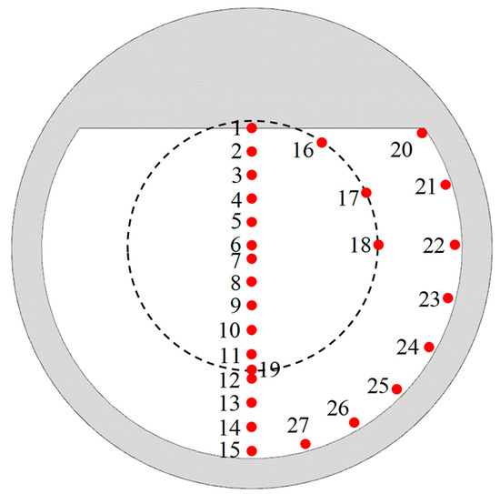 In this case, a large-scale and complex-shaped floating tourist platform with inner domain water resonance is considered. As shown in Figure 7, the platform has the dimensions of , , a chord distance of and a vertical height of . The structure of the floating tourist platform is symmetrical and similar to the closed circular harbors. The maximum elevation of the oscillating wave surface in closed circular harbors tends to occur at the symmetry axis along the wave propagation direction and at the solid wall boundary. As shown in Figure 8, twenty-seven wave gauges are placed in the inner domain of the platform, and the free-surface elevation, captured by each wave gauge under different wave motions, is recorded, where the maximum value is taken as the representative of the free-surface elevation for that working condition. Figure 9 shows the computational domain, where the platform is 10 wavelengths away from the wavemaker, and a sponge layer is set at the end of the calculation domain to absorb wave energy. The coordinate origin is located at the center of the wave-making boundary at the still-water surface. The draft of the platform is 10 m, and the still-water depth is in the computational domain. The incident wave is the regular wave generated with linear wave theory. The wave height , the wave frequencies range , and the frequency range includes common wave frequency waves for ocean engineering and long-period waves.