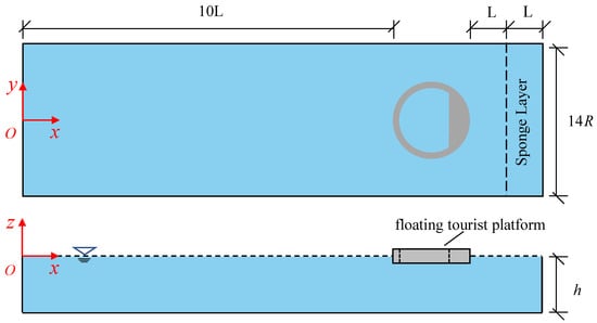 Figure 3 shows the schematic diagram of the floating tourist platform structure. The coordinate system in the figure is used as an indication of direction only. Unlike moonpools and harbors, the floating tourist platform is a circular thin-walled structure with a large area of water inside the platform, beyond which there exists a region enclosed by a straight line (which is known as a chord in mathematics) and circular curve in the inner domain of the platform. The complex structural characteristics may make the inner domain of the platform with multiple resonant frequencies and water resonance patterns more complex. Therefore, an accurate and effective prediction of the resonant response of the water surface inside the floating tourist platform under the wave action, and analysis of its resonant frequencies and modes, are essential for its safety assessment and structural optimization in the design phase.