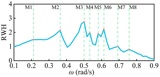 In the numerical simulation of the floating tourist platform, an encrypted grid is used locally in the platform area, and the horizontal grid spacing of , as well as a vertical grid system, is constructed by using 14 layers with and . The time step is controlled by setting the maximum Courant number (CFL) to , and the total simulation time is up to wave periods. Figure 10 shows the resonant response of the water in the inner domain of the floating tourist platform in the frequency domain calculated by the non-hydrostatic pressure model. It can be seen that there are eight peaks in the RWH curve of the water resonance in the inner domain of the floating tourist platform. These eight peaks correspond to the modes named M1~M8 according to the frequencies from low to high. From Table 2, the M1~M6 modes of the floating tourist platform , M7~M8 modes’ , and the M3 mode RWH value is a maximum of 2.75, while the resonance of the water in the inner domain of the floating tourist platform is more obvious. Except for the M1 mode, which is excited by long-period waves, all the other modes excited by wave frequencies belong to common wave frequencies. As we know, long waves are more penetrating than short waves. As the wave frequencies continue increasing, the wave energy entering the inner domain of the platform decreases, the resonant modes are harder to excite, and the resonant amplitude gradually decreases. In contrast to the circular moonpools and circular harbors resonance, the water domain’s maximum wave surface response mode within the floating tourist platform is the M3 instead of the M1. When the resonant modes in the common wave frequencies range are excited, the maximum wave surface elevation of the water domain in the platform is larger than the incident wave, and it is necessary to take measures to restrict the amplitude of the resonant mode response in engineering practice.