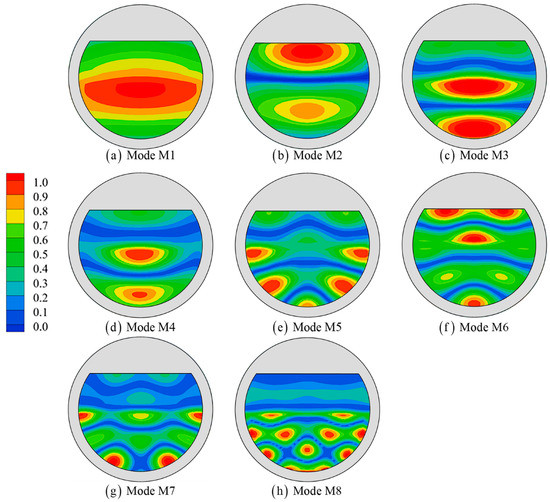 The six resonant mode shapes of the tourist platform are presented in Figure 11. The wave height distributions are normalized by the maximum wave height of each resonant mode. Hence, the color bar is used for all shapes and varies from 0.0 (blue) to 1.0 (red). In mode M1, there is no nodal wave line, and there is a uniform heave of the free surface within the platform; this resonance mode is called the piston mode. In modes M2~M6, the free surface within the platform slosh repeats, which is called the sloshing mode. As the higher-order sloshing modes are excited, the nodal wave lines are curved and show circular modes. From the distribution of the M7 and M8 modes, a wave exists only in half of the inner domain of the platform, and the other half has little water surface rise and fall. This is because the waves corresponding to the M7 and M8 modes dissipate all the energy in the propagation process and cannot form a stable wave field in the whole inner domain of the platform. Therefore, M7 and M8 are not considered resonant modes, and the next study only focuses on the first six modes.