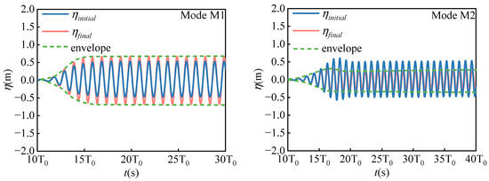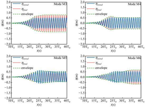Figure 12 shows the free-surface elevation time histories of WG6 in the inner domain of the platform before and after the resonant frequencies’ wave effect. represents the wave surface time history of WG6 without a floating tourist platform in the numerical wave tank. represents the wave surface time history of WG6 after the placement of the floating tourist platform in the numerical wave tank, and the short underline is the envelope of . It can be seen that the slope of the envelope gradually decreases from the M1 mode to the M6 mode, and the time required to form a stable wave field in the inner domain of the floating tourist platform increases. A fixed floating platform is similar to a closed harbor, where wave energy from each period enters the inner domain of the platform through its unique wave energy flux. Long waves have a high wave energy flux, and the corresponding wave motion within the platform can be stabilized quickly, while the opposite is true for short waves.