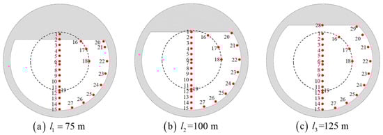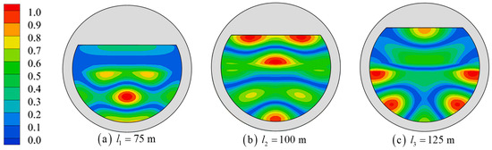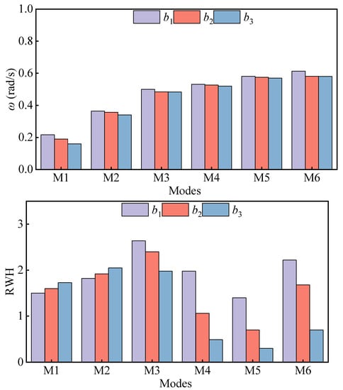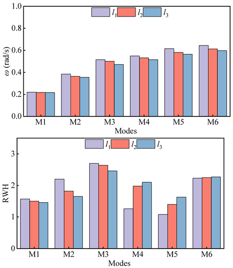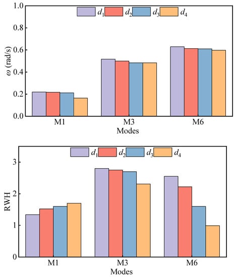 Compared with the inherent wave modes of the traditional closed circular harbor, the water resonance in the inner domain of the floating tourist platform is influenced by the chord in its structure, and the different chord distances will directly change the platform structure and significantly affect the water resonance in the inner domain of the platform. Figure 17 shows the arrangement of wave gauges with three different chord distances. With different chord distances, the position of the wave gauges near the location of the chord varies. Figure 18 shows the resonant frequencies and RWH distribution of the M1~M6 modes when the chord distance , , is calculated for the water resonance in the inner domain of the platform. With the increase of the chord distance, the resonant frequencies of all modes decrease, the RWH of the M1~M3 modes decreases, and the RWH of the M4~M6 modes increases. On the one hand, the existence of a chord is similar to a straight breakwater, where wave energy is reflected and transmitted. The larger the chord distance and the shorter the chord length, the less ability there is to reflect wave energy and more ability to transmit it. On the other hand, the larger the chord distance is, the shape of the floating tourist platform tends to be circular, and the waves inside the platform are easier to focus on one point. The penetration of low-frequency waves is greater; thus, the influence on the M1~M3 mode is greater for the penetration ability of the chord. As the chord distance becomes larger, more wave energy flows out, thus leading to a decrease in the wave energy in the inner domain of the platform and a reduction in the amplitude of the water co-oscillation. For the high-frequency waves with weak penetration, which are influenced by the circular feature of the platform, the larger the chord distance, the easier it is to focus the waves in the inner domain of the platform, and an increase in the amplitude of the water co-oscillation occurs. As shown in Figure 19, Figure 20 and Figure 21, the shape of the M1 mode is less affected by the increase of the chord’s distance, the nodal wave line of the M3 and M6 modes is bent, and the position of the maximum wave height distribution shifts toward the inner wall of the platform.