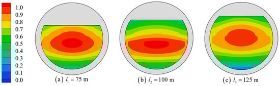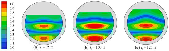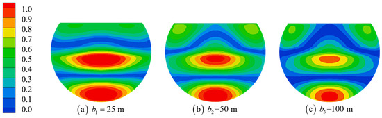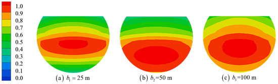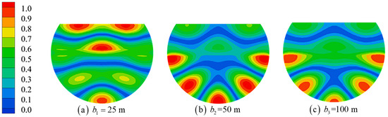 The wall thickness of the floating platform is one element that affects its inner domain water resonance. In order to study the effect of the wall’s thickness on the resonance of the water in the inner domain of the platform, three different cases of wall thicknesses were set up in all three cases, including and the wall thicknesses of , , and . Figure 13 compares the resonant frequencies and co-oscillation amplitudes of water for the different wall thicknesses and MI~M6 modes. With the increase in wall thickness, the resonant frequencies of the M1~M6 modes are reduced, the RWH of the modes M1 (piston mode) and M2 (first-order sloshing mode) increase significantly, and the RWH of the modes M3~M6 decrease. The wall thickness of the floating tour platform is similar to a filter. The lower frequency wave is less affected, and the higher frequencies are more affected by it, and different wall thicknesses correspond to different filtering capacities. The larger the wall thickness, the stronger the filtering ability, where the M1 and M2 modes correspond to the strong penetration ability of the low-frequency wave. The increase in wall thickness will weaken the long-wave energy entering the inner domain of the platform by a small amount while reducing the wave energy flowing out of the inner domain of the platform, resulting in a small increase in total wave energy. The wave energy corresponding to the M3~M6 modes is mostly attenuated, the energy gathered in the inner domain of the platform is reduced, and the value of the co-amplitude of the inner domain water is smaller. Figure 14, Figure 15 and Figure 16 show the representative shape distribution of the M1, M3 and M6 modes with different platform wall thicknesses. As the wall thickness becomes larger, the nodal wave line bending of the three modes occurs, circular characteristics are enhanced, the maximum wave height distribution range shrinks, and the distribution position moves toward the incoming wave direction.