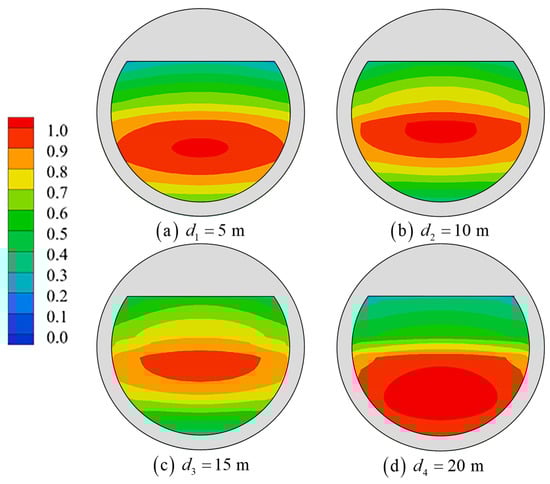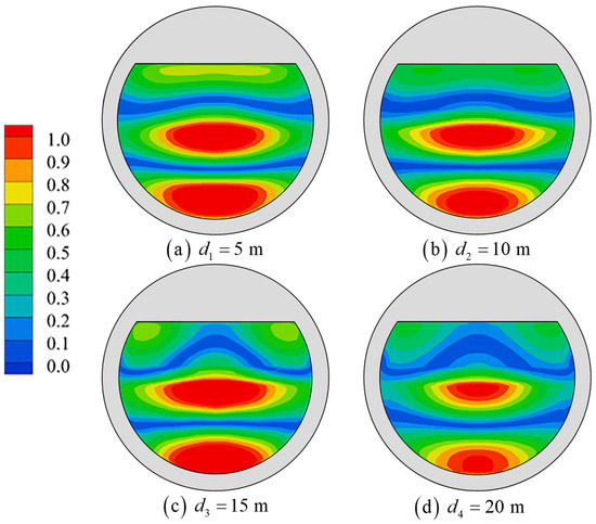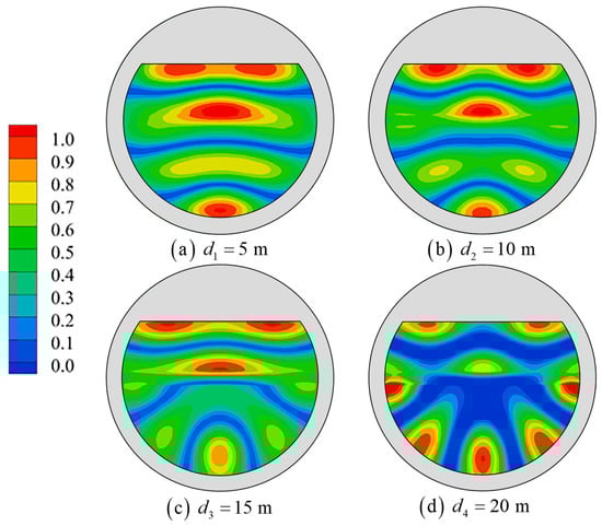 In addition to the mentioned results, the M1, M3 and M6 modes with intense resonance are selected to investigate the effects of drafts on the free-surface elevation of the inner domain of the platform. Four sets of the draft are set for the cases of 5 m, 10 m, 15 m, and 20 m, respectively. The results are shown in Figure 22, where with the increase in draft depth, the resonant frequencies of each mode decrease, the RWH of the M1 piston mode increases, and the RWH of the M3 and M6 sloshing modes decreases. Under the action of the surface wave, the horizontal excitation force of the wave action on the water in the inner domain of the platform increases with the increase of the draft due to the increase of the wet area, and the vertical wave excitation force decreases with the increase of the draft, so the horizontal motion of the water in the inner domain increases and the vertical motion is reduced. Therefore, in the M1 piston mode, the co-oscillation amplitude value becomes larger with the increase of the draft, and in the sloshing modes, the co-oscillation amplitude value decreases with the increase of draft depth. As shown in Figure 23, Figure 24 and Figure 25, the draft increases, the shape of the piston mode M1 has less influence, the sloshing modes of the M3 and M6 nodal wave lines thus bend, and the position of the maximum wave height distribution moves toward the inner wall of the platform.