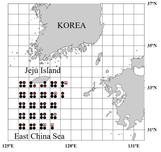 Location of sampling stations of Muraenesox cinereus eggs and preleptocephali in waters adjacent to Jeju Island in August 2020 and 2022. White dots indicate stations where M. cinereus eggs were collected. White squares indicate stations where M. cinereus preleptocephali and leptocephali were collected. Black dots show sampling stations using the bongo net. Red triangles show sampling stations using Multiple Opening/Closing Net and Environmental Sensing System (MOCNESS).